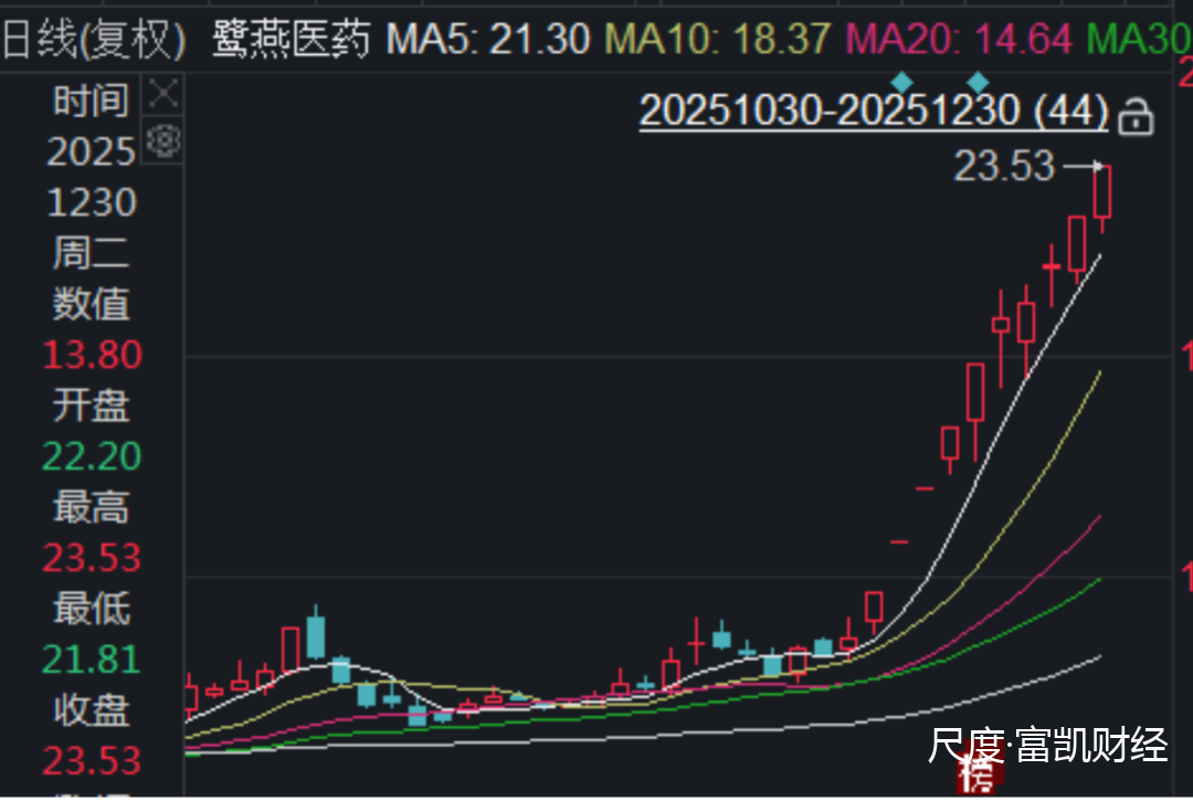 近日,鹭燕医药股价节节高涨,截至12月30日,公司股价涨至23.53元/股。对于股价在8元价位上下波动的鹭燕医药,此次股价大涨引起市场关注。