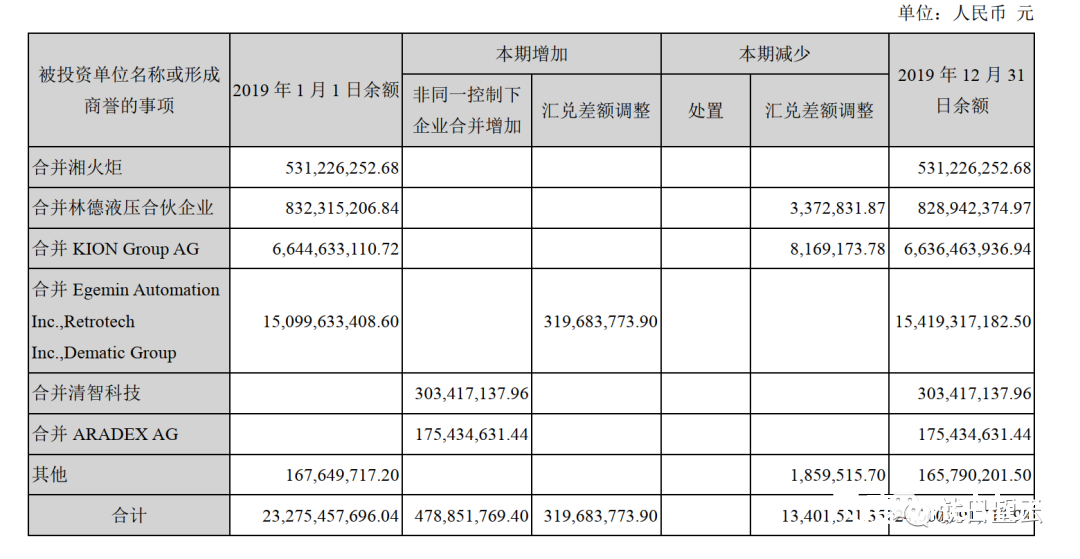 最大的几笔分别是并购德马泰克,凯傲集团,林德液压,共约210亿左右,收购德马泰克的主体为凯傲集团,林德液压现在属于凯傲的子公司,凯傲是在德国法兰克福的上市公司,截止2021.2.26市值为92.62亿欧元,换算成人民币约为723.87亿人民币,潍柴占比45%,约为325.74亿,2019年KION全年营收67,177,068,615.05,净利润,2,653,818,104.80,至少现在看不到“暴雷”的迹象。