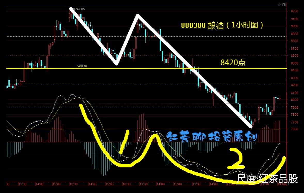 当然,从1小时级别来看,酿酒板块目前还没有形成底背离的结构,有意思的是1小时级别的8420点多空分水岭刚好与日线级别的8400点整数关口重叠,说明这里是一个重压力区。也正因为这样,红茶认为短期不适合追高加仓,当酿酒板块越向上靠近8400点压力时,仓位过大的可以先适当减仓。而后再借调整的机会,把减仓的部分接回。