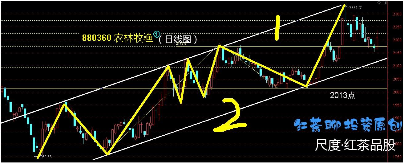 (农业板块)日线级别的结构保持不错,属于上涨趋势(也属于上涨通道),其中2号线为支撑,2013点为多空分水岭。由于农业板块的结构不错,因此当它靠近2号线的时候,就可以视为反弹前的低吸机会。结构上,只要不跌破2013点支撑位,日线级别的结构就算是安全的。