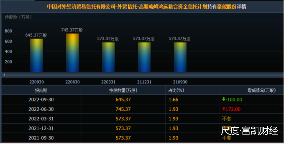 去年三季度,高毅晓峰鸿远集合资金信托计划开始出现在豪能股份的股东名单,持仓573.37万股,今年第二季度加仓至745.37万股。不过,截至三季度末,豪能股份在邓晓峰的重仓股中表现垫底,或许是导致其减仓的原因之一。