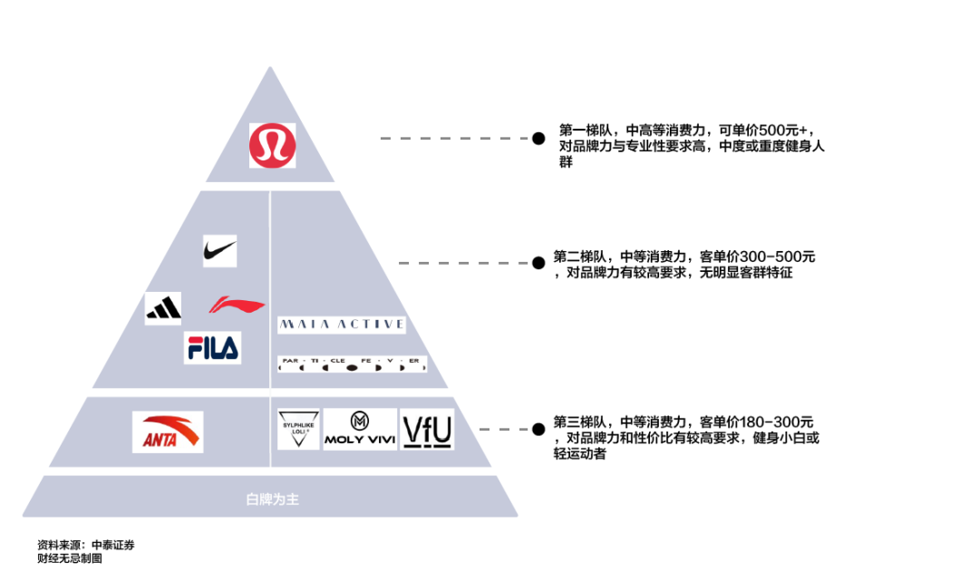 观察来看,目前女子运动时尚整体也已形成一座品牌金字塔结构,lululemon依旧在高端市场占领消费者心智,本土品牌大多集中在中端以及中高端的市场,根据不同的产品定位形成了用户的分层;低端市场则是以一些供应商白牌为主。