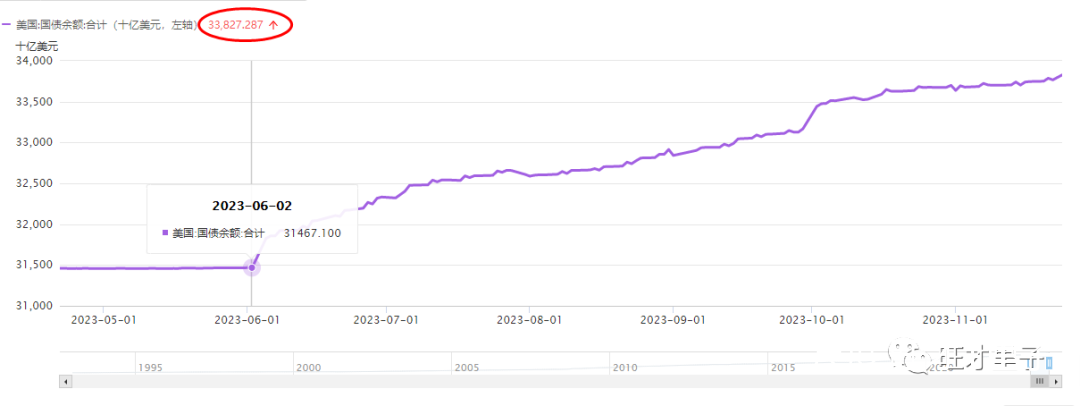 美国国债余额从6月初的31.4万亿美元,升到了33.8万亿美元。