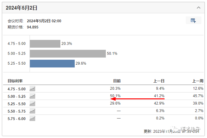 明年5月首次降息25个基点的概率已从41%升到了50%,如果预言能够成真,意味着明年美联储将向市场高举白旗。