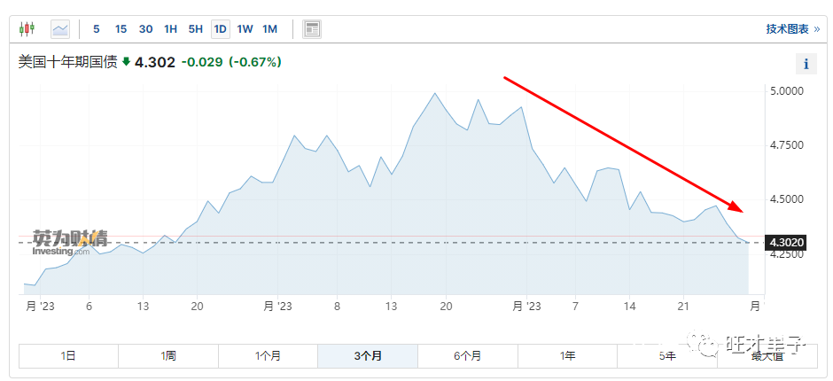 最近一个月,十年期美债收益率从接近5%,回调到了4.3%。