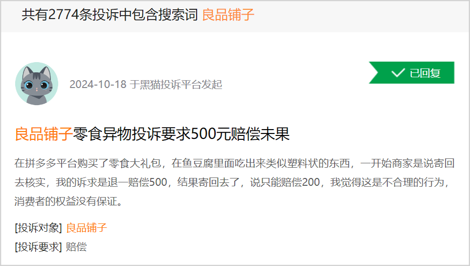 在黑猫投诉网站上,有关良品铺子的投诉高达2774条,内容涉及吃到异物、食品发霉变质等。