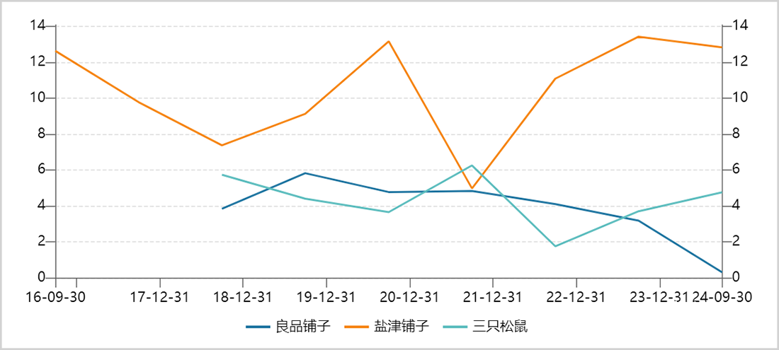 净利率表现更加羸弱,最新数值仅为0.3%,较2023年同期大幅下行2.9个百分点。这大幅低于盐津铺子、三只松鼠同期的12.8%、4.8%。