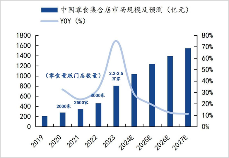 全国零食量贩门店数量从2020年的2000家快速裂变至2023年的2.2万家以上,市场规模攀升至800亿元,已占据休闲零食总市场规模的7%左右。