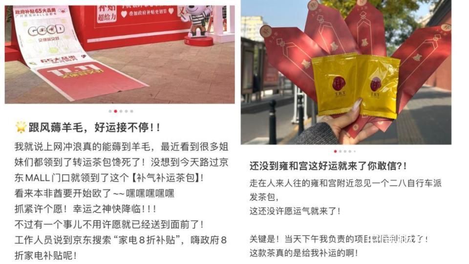为了让更多消费者薅到政府补贴的大羊毛,京东家电就联合京东健康、京东超市,和北京同仁堂、神农金康、雷允上、1734、方家铺子等国医级别养生品牌来了一次跨界联名,免费的定制款“国补茶包”和抽签仪式,就在线下吸引了众多养生人的围观打卡。有小红书网友甚至发文在雍和宫领取“国补茶包”后,在好运加成下,当天负责的项目就顺利通过。