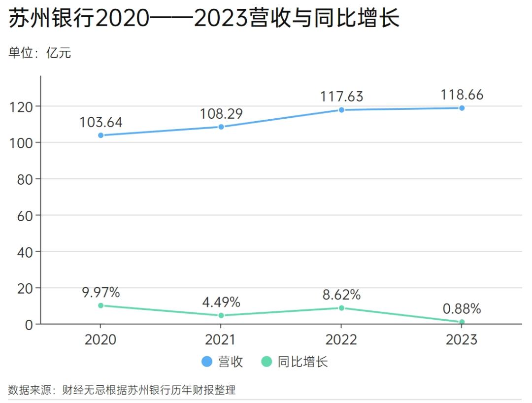但从2020年开始,苏州银行营收增速跌破两位数,营收表现一直不太稳定,增速起伏较大。2021年、2022年都维持个位数增长,甚至在2023年全年实现营业收入118.66亿元,同比增长仅0.88%。