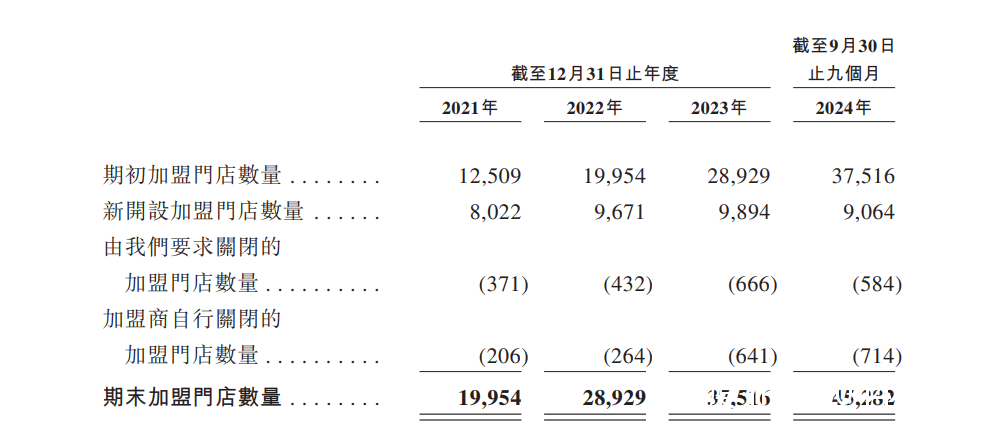 招股书显示,2021年至2024年前9个月,蜜雪冰城关闭的加盟门店数量分别为577家、696家、1307家及1298家。其中,加盟商自行关闭的加盟店数量持续增加,分别为206家、264家、641家、714家。虽然数量在增加,但关闭门店在其整体门店中的占比并不高。