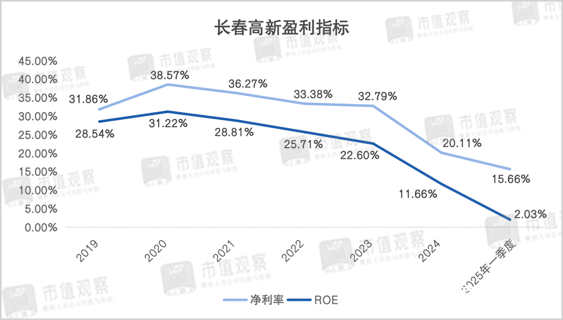 2024年是长春高新业绩显著下滑的一年,营收同比下降了7.55%至134.66亿,降幅虽然不大,但净利润却同比下降了43.01%至25.83亿;今年一季度延续颓势,净利润再次下跌了44.95%。