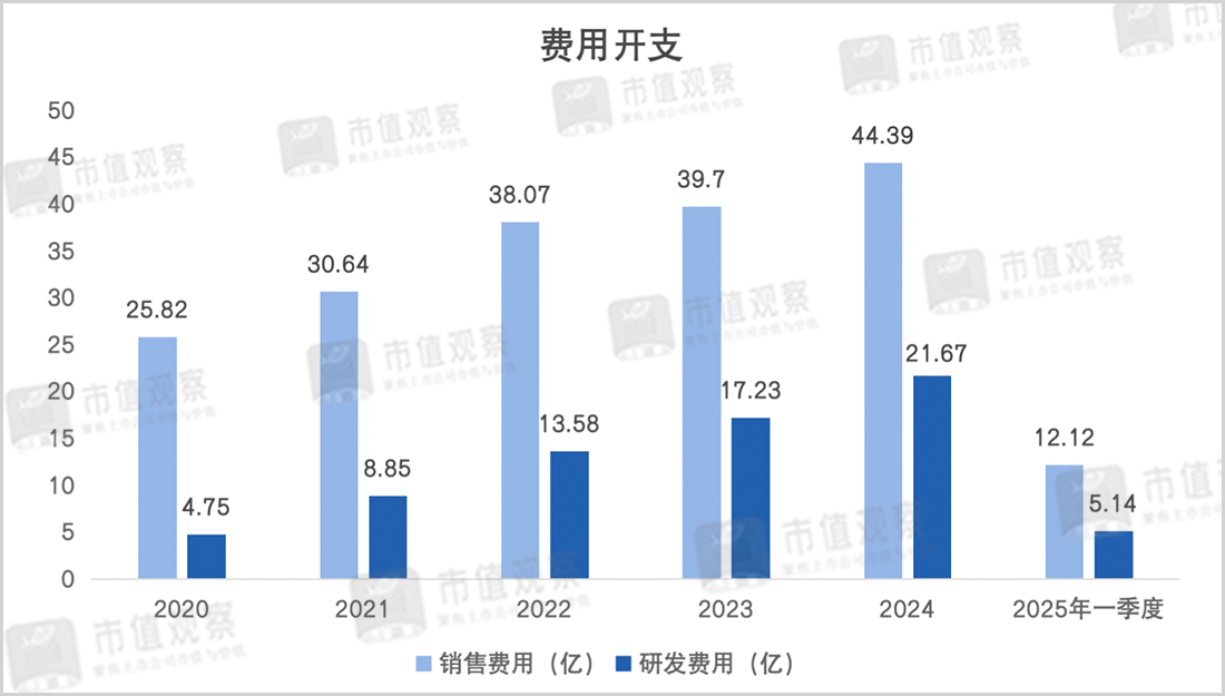 生物医药作为典型的高投入产业,多领域出击必然少不了前期费用的大笔投入,在2020年至2024年4年间,销售费用从25.82亿一路增长到44.39亿,研发费用也从4.75亿增长到21.67亿,开支的迅猛增长也是挤压净利润的重要原因。