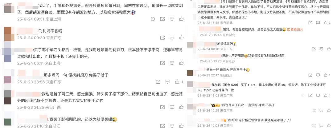 不少用户在真正试用、体验产品之后,吐槽剃须刀剃不干净、电机声音太大、电池续航短等等,甚至有网友说产品的电机震手,刮个胡子“手都被震麻了”。