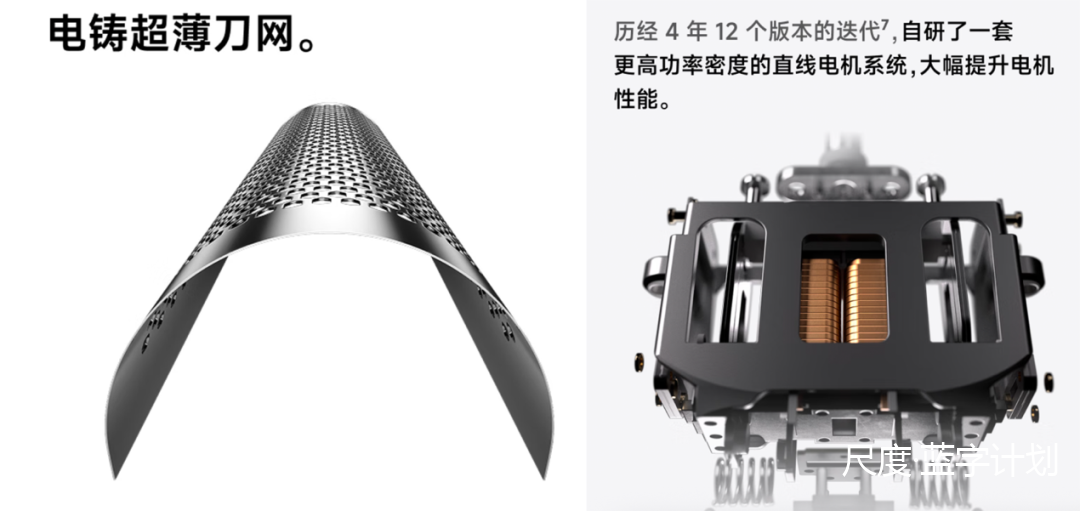 但是,单刀网的徕芬 T1 Pro 就没法享受这种“团队协作”的红利了。同时为了让产品追上同价位多刀网产品的清洁效果,徕芬的做法是“力大砖飞”,不仅采用了 12000转/分钟的自研高速直线电机,还采用了厚度只有55μm 的镍合金材质刀网,追求尽可能从胡子根部快速剃须。