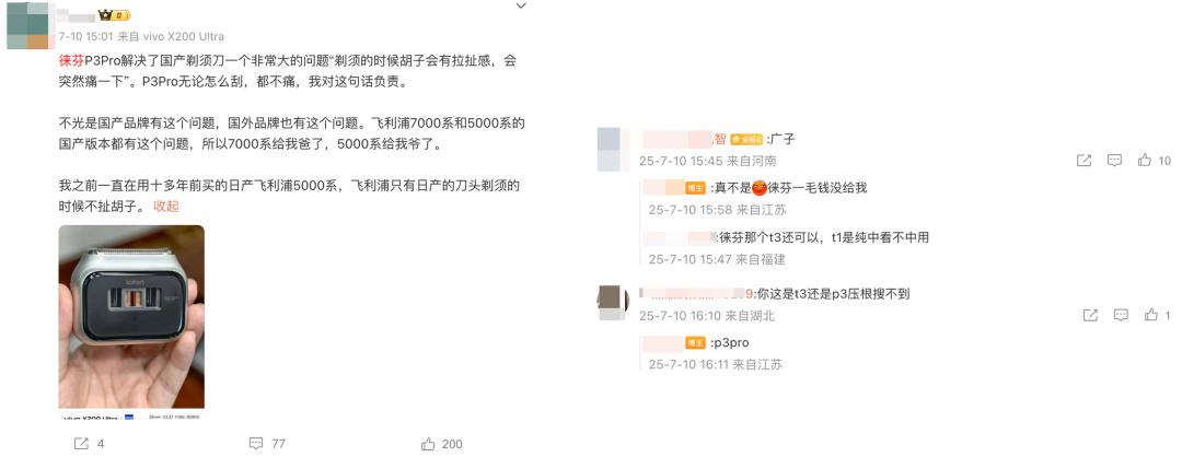 另一个问题更是这次徕芬电动剃须刀的暴风眼:胡子刮不干净。这个问题在单刀网的徕芬 T1 Pro上更加突出,网上那些说徕芬刮不干净胡子的用户,十有八九都是 T1 Pro 的用户。