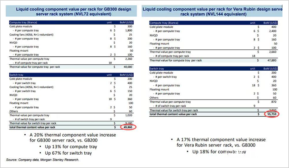 而下一代Vera Rubin NVL144平台的散热成本将更高,预计每个机柜的冷却组件总价值将增长17%,达到55710美元(约40万元),冷却模块的价值将显著增长67%。
