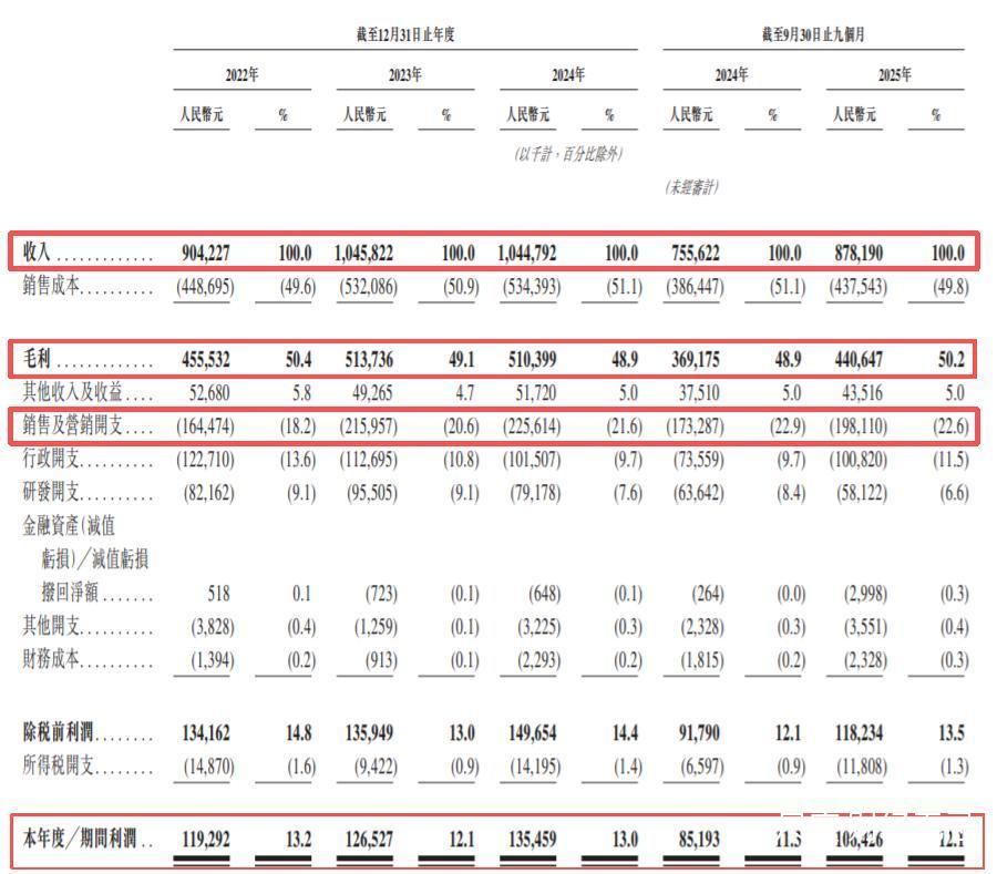 重营销、轻研发的SKG,研发费用率从2022年的9.1%一路降至2025年前三季度的6.6%,而销售费用率却从18.2%攀升至22.6%。