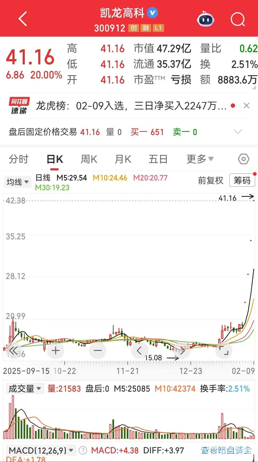 从二级市场表现来看,凯龙高科2025年的股价大多在16元的价位徘徊,而到了2026年1月初,公司股价有小幅上涨。此后,2月4日至2月9日,公司股价连续4个涨停,最后报收41.16元/股,涨幅高达107.36%。