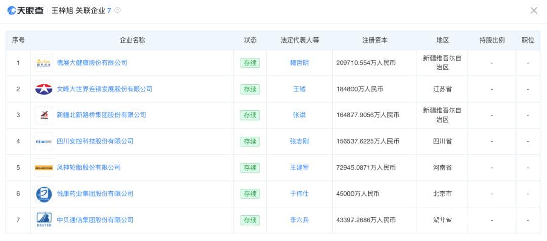 另据天眼查,有一位名为“王梓旭”的老板,其名下目前关联着德展健康、悦康药业、文峰股份等7家公司。
