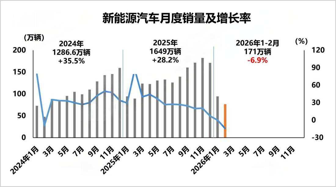 从数据来看,经过前两年烈火烹油的发展以及政策退坡影响,汽车销量出现下滑。2026年1-2月,汽车产销分别完成412.2万辆和415.2万辆,同比分别下降9.5%和8.8%。其中的2月份,新能源汽车产销69.4万辆和76.5万辆,同比分别下降21.8%和14.2%。