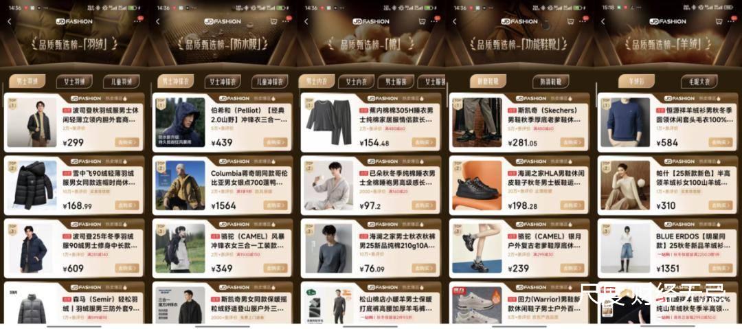 京东JD FASHION还同步发布了品质甄选榜,包含羽绒、棉、三防、羊绒羊毛、功能5大品类,共14个榜单里,覆盖了超300个服饰鞋靴产品。