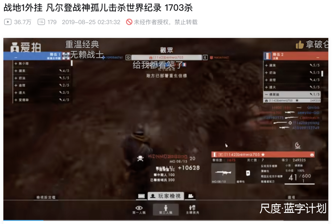 有个著名的案例,一名《战地1》玩家几乎原地不动,依靠外挂自动攻击,在一局游戏里击败了1703名对手,让游戏进入原始失序的状态。小琶说,“外挂带来的伤害,远远不是输掉一两局那么简单,它污染了我的心理预期,消解了努力的意义。”