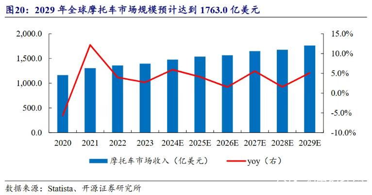 近年来,全球摩托车销量稳步提升。根据Statista数据,2024年全球摩托车销量约为5680万台,同比增长4%;预计2029年全球摩托车销量将达6280万台。市场空间方面,2024年全球摩托车市场规模为1479亿美元,2029年预计达到1763亿美元,2020—2029年期间复合增长率为4.7%。